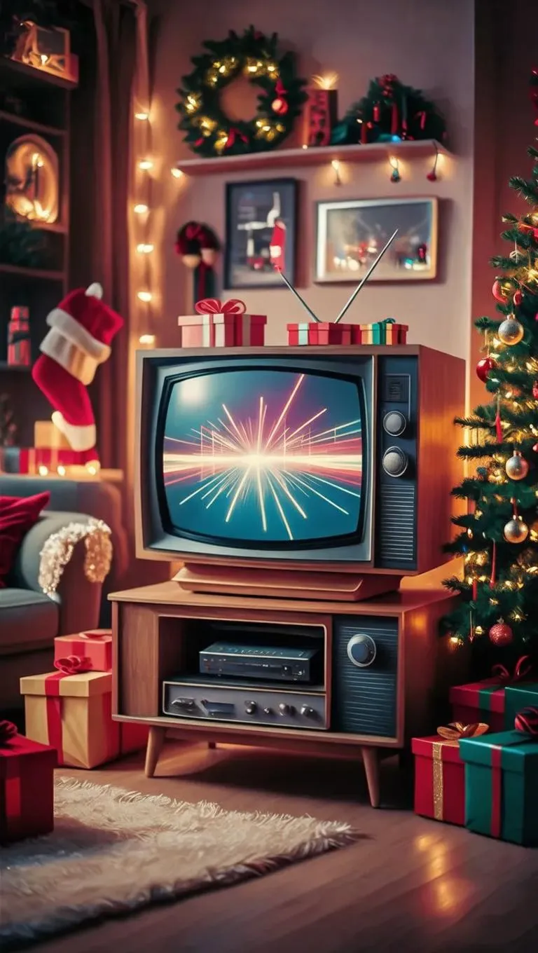 Step into a retro 80s Christmas living room with a vintage box TV glowing in Synthwave neon. AI-generated visuals blend nostalgic holiday decor and retro-futuristic vibes, perfect for creating mesmerizing, nostalgic scenes that merge 80s charm with futuristic aesthetics.