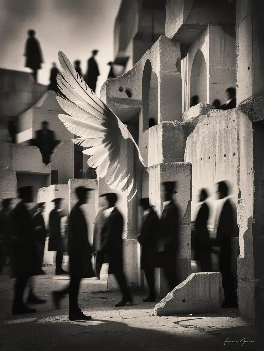 Vintage black and white photo blending historical intrigue with surreal humor. High-contrast lighting, blurred silhouettes, and fragmented concrete evoke tension, while a subtle wing-like shadow symbolizes freedom. Angular perspectives and faint feathered outlines add enigmatic symbolism. Explore AI-generated vintage visuals with vivago.ai’s creative tools for evocative, layered compositions merging history and mystery.