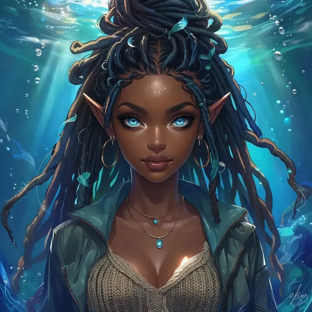Create a vibrant anime character with dark skin, elf-mermaid hybrid features, and striking blue eyes. Design detailed dreadlocks, afro, or curly hairstyles paired with trendy outfits like sweaters, jackets, skirts, or pants. Use AI tools to generate dynamic visuals with shiny hair textures and fantasy elements. Perfect for anime art enthusiasts seeking unique, culturally diverse character designs.