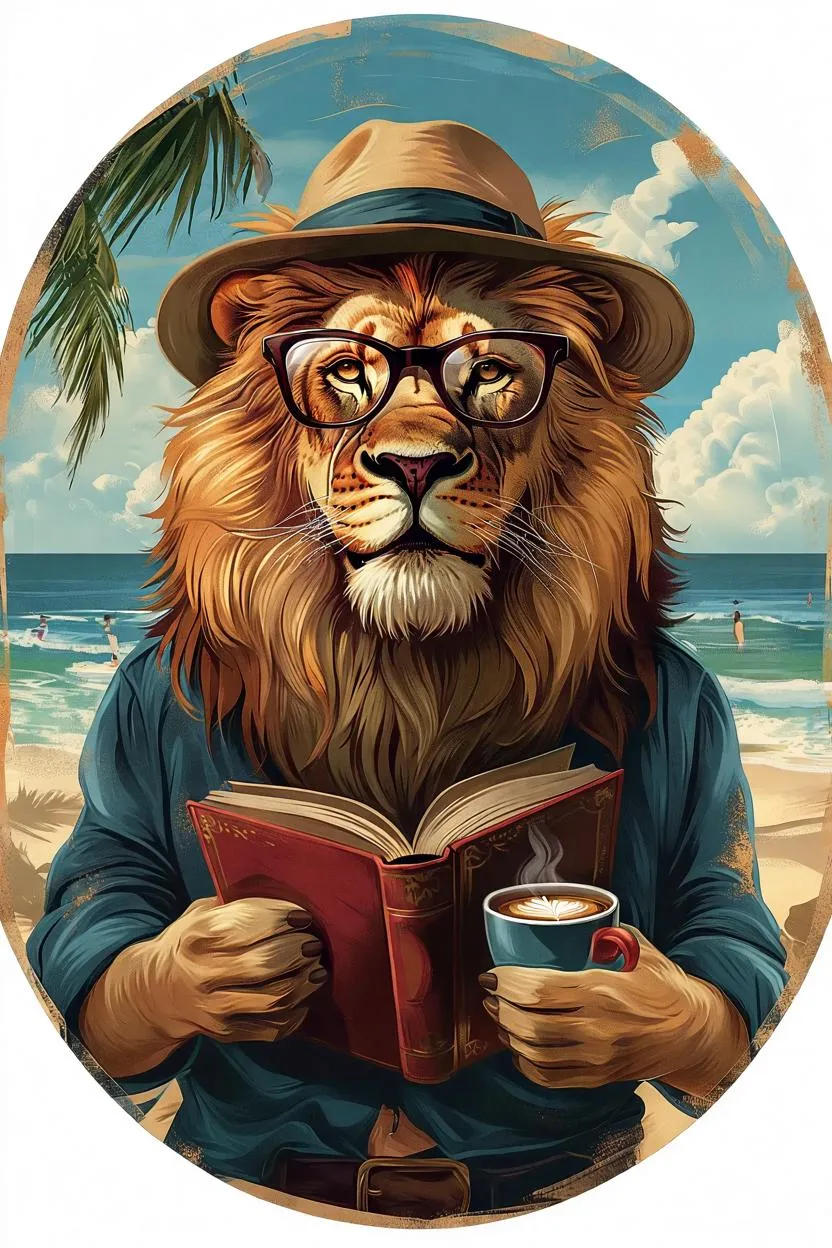 Generate a vintage lion illustration with black glasses, hat, book, and coffee on a beach, enclosed in a circular frame. AI-powered tools create retro-inspired visuals on transparent backgrounds. Perfect for creative projects, posters, or branding. Elevate designs with nostalgic, whimsical artistry. Keywords: vintage illustration, AI-generated art, transparent background, retro aesthetics.