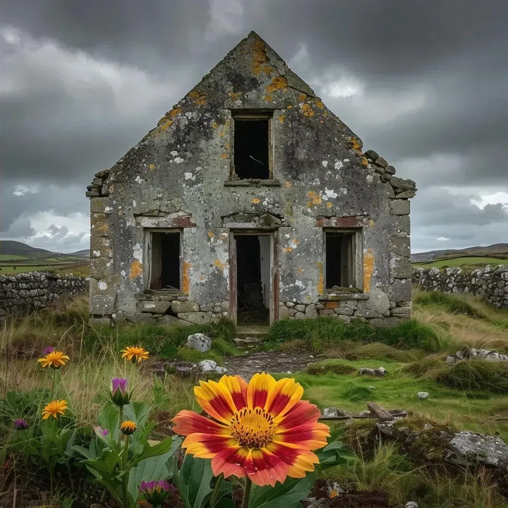 Generate an abandoned Irish village with vivago.ai's AI image generator. Highlight a vibrant, glowing flower on a weathered house, blending haunting decay with vivid life. Perfect for surreal visuals, professional-grade projects, and creative storytelling. Explore AI-powered contrasts now.