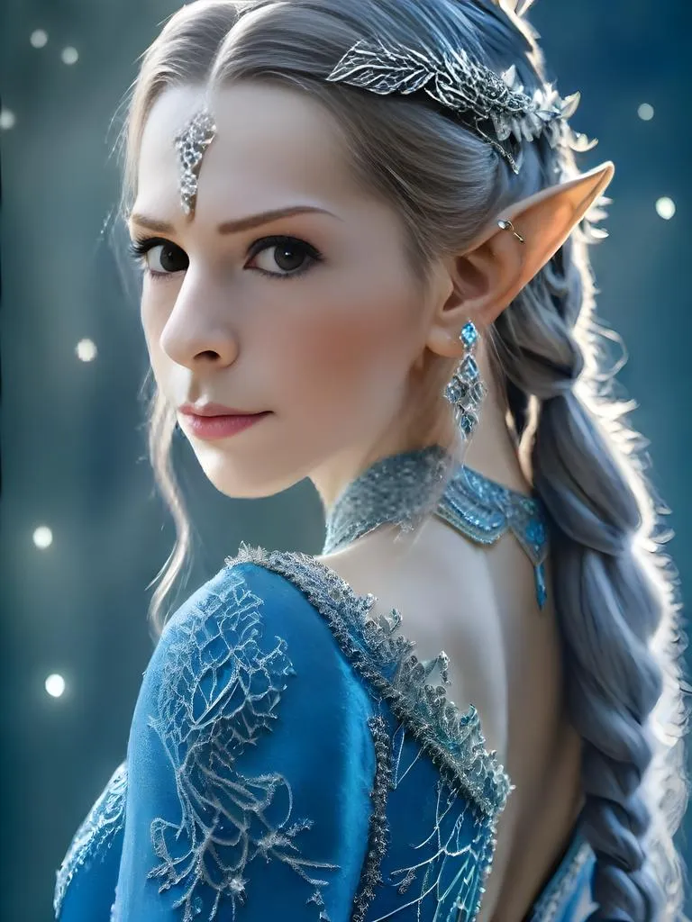 Generate an AI image of an Elven princess in a flowing blue gown with silver accents, featuring intricate braided updo with folded ponytail. Tight and macro shots highlight ultra-HD textures, luminous skin, and fantasy details. Create enchanting fantasy portraits with vivago.ai's AI image generator for high-resolution, lifelike character art.