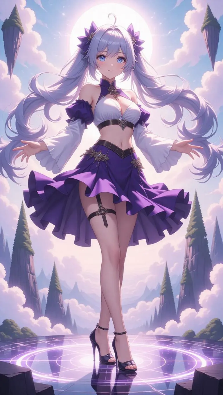 An anime sorceress with voluminous silver hair stands in a summoning circle, her chest-exposing top and high-heeled sandals accentuating her figure. She summons magic, with dreamlike clouds encircling her, casting a soft, dreamy light. The gentle wind flows around her, adding a dreamy energy to the scene. The environment is surreal and whimsical, with floating islands in the background. The lighting is soft and pastel, highlighting her whimsical expression and the intricate details of the magic circles. Style: Anime, with a touch of dreaminess.