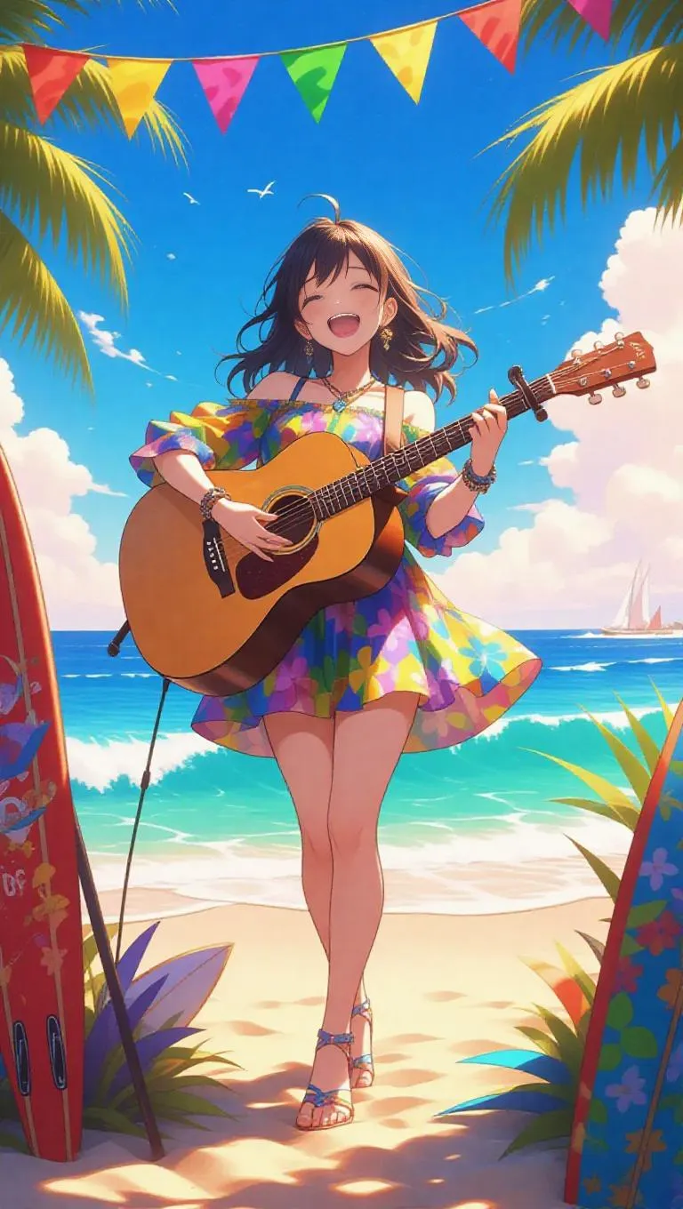 A joyous anime musician with colorful clothing, mid-performance strumming an acoustic guitar. She stands on a vibrant beach adorned with surfboards, the air filled with laughter and ocean waves. Warm, golden light from the sunset casts a cheerful glow, highlighting the musician's animated expression and the lively beach atmosphere. The scene is infused with a sense of celebration and freedom, capturing the essence of a sunny day by the sea.