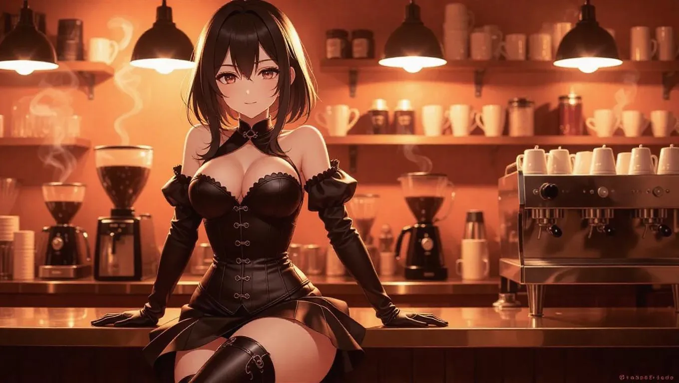 A stylish anime barista leans against a polished counter, her tight corset dress and knee-high boots accentuating her figure. Her eyes glint flirtatiously under the warm, ambient cafe lights, which cast a soft glow over her. Rows of steaming coffee cups line the background, adding a vibrant touch to the scene. The lighting is warm and inviting, creating a cozy and intimate atmosphere. Style: Anime.