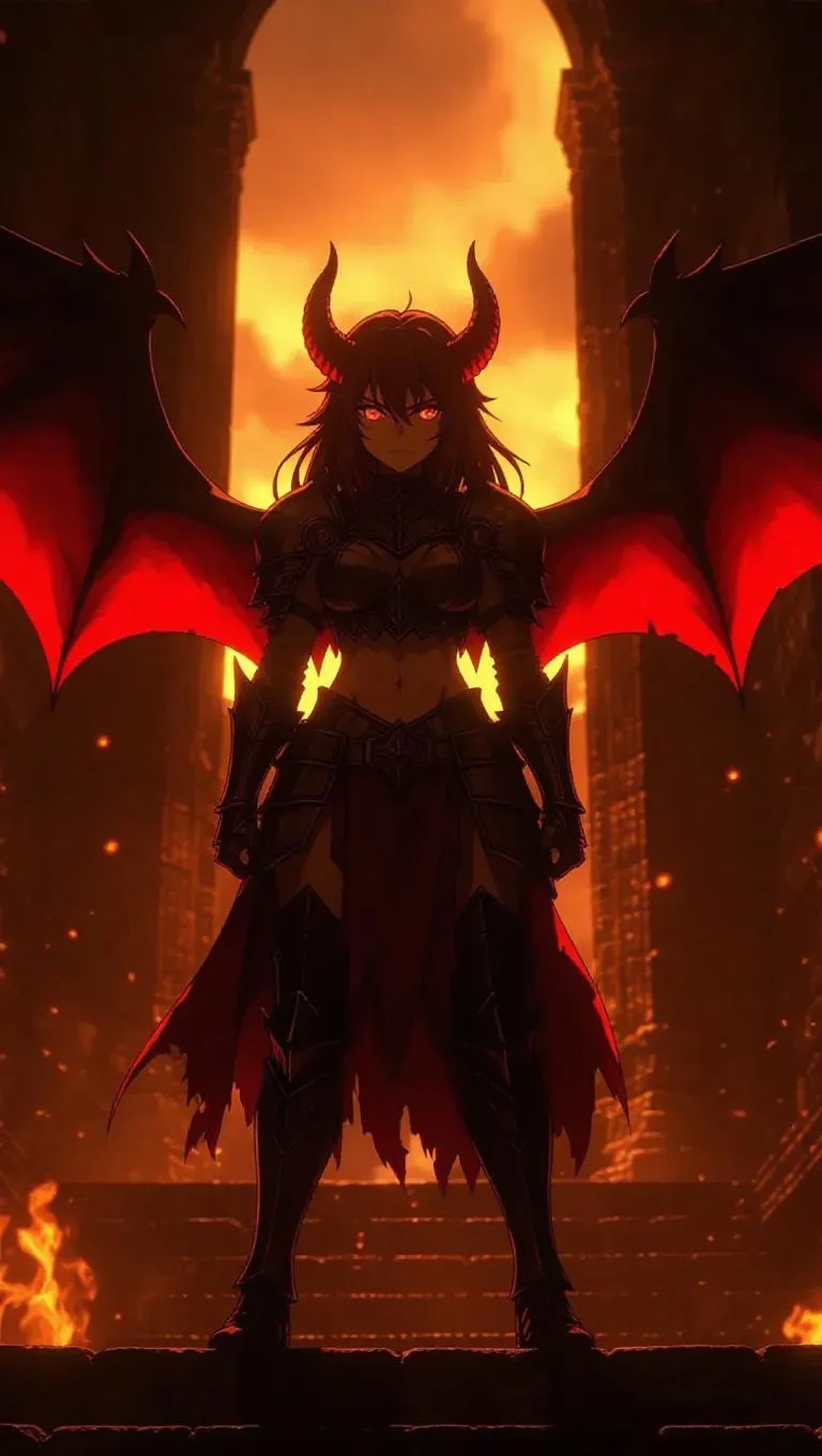 A fierce anime demon girl with glowing red horns and shimmering wings stands in an ancient ruined temple at dusk. She wears a battle-worn tunic that showcases her warrior spirit. Her eyes flash with determination as she prepares to battle unseen foes. Flames flicker in the darkening sky behind her, casting dramatic shadows and highlights. The scene is illuminated with earthy tones and glowing orange, creating an adventurous and captivating atmosphere. The style combines historical and anime aesthetics, reinforcing the grand and epic nature of the image.
