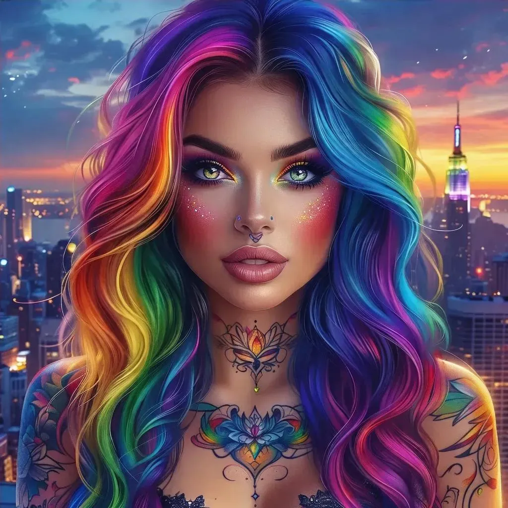 Create vibrant AI-generated art of a striking woman with rainbow hair, intricate tattoos, and bold makeup using Vivago.ai. Transform text prompts into eye-catching digital portraits, blending vivid colors and creative details for professional, unique visual content.