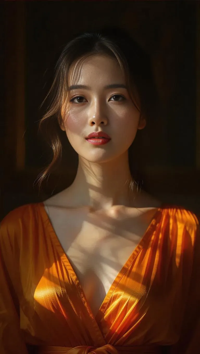 Create a vibrant AI-generated oil painting of a confident Vietnamese woman in a dim studio. Experience luminous golden light, velvety textures, and a triadic color scheme blending warm hues. Masterpiece-quality 8K portrait with expressive brushstrokes, vivid colors, and captivating depth—powered by AI tools for professional-grade luminous art. Ideal for dynamic, energy-filled visual storytelling.