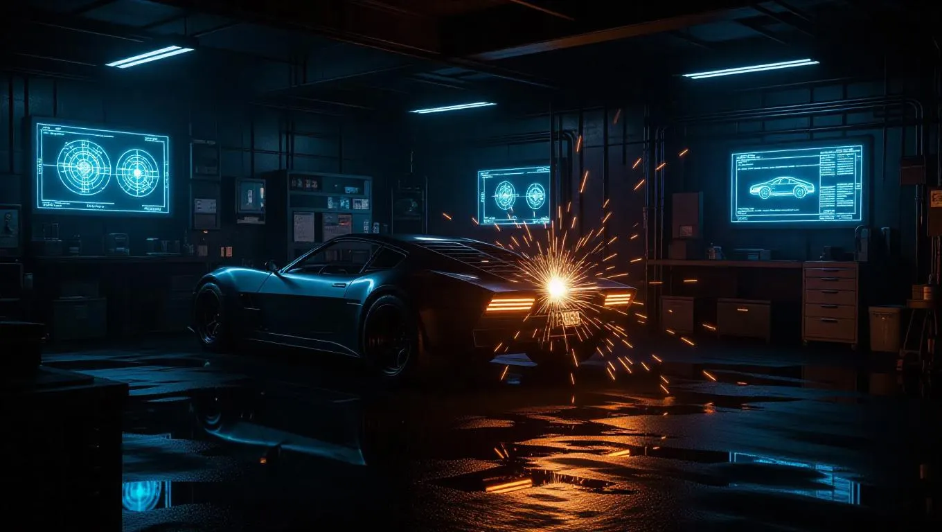 A shadowy garage buzzes with welding sparks, where futuristic vehicles are rebuilt for the black market. Holographic blueprints flicker on cracked screens, and chrome dazzles under harsh neon lights. Gritty cyber-crime aesthetic with oily reflections and heat distortion.