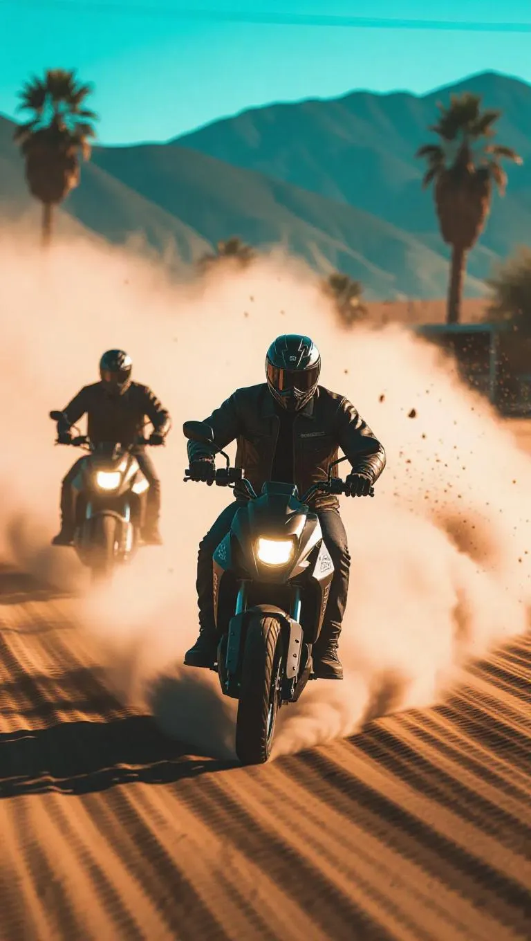 The desert outskirts of San Andreas, a dramatic backdrop for an epic showdown. CJ, riding a powerful electric scooter, engages in a intense shootout with a rival gang on ATVs. Dust clouds swirl around them, the setting sun casting long shadows and teal hues, enhancing the raw tension and visual spectacle.