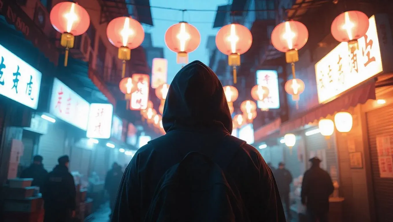 A fugitive in a torn hoodie whispers through a shadowy Chinatown market, neon signs fading into dim backgrounds, as police search teams sweep through. Lanterns flicker hauntingly above. Aerial drone perspective with studious depth and environmental storytelling.