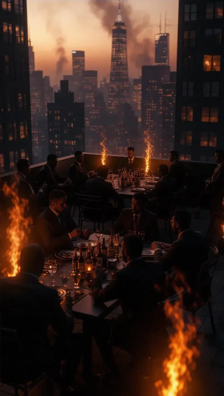 A lavish rooftop party erupts into chaos as rival gangs clash over a high-stakes cryptocurrency deal. The city skyline is shrouded in mist, with flames illuminating the atmosphere. The scene is captured with a mysterious, high-contrast tone, emphasizing the tension and excitement.