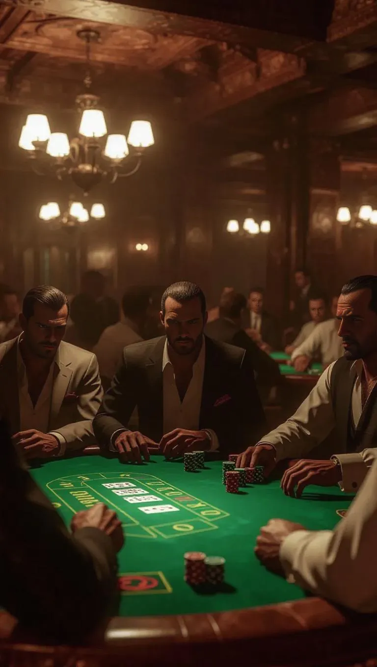 In a dimly-lit underground casino in Liberty City, a tense high-stakes poker game is abruptly interrupted by a rival gang. Tables overturn, drinks scatter, and players exchange glances, the room erupting into chaos as they prepare to defend their territory.