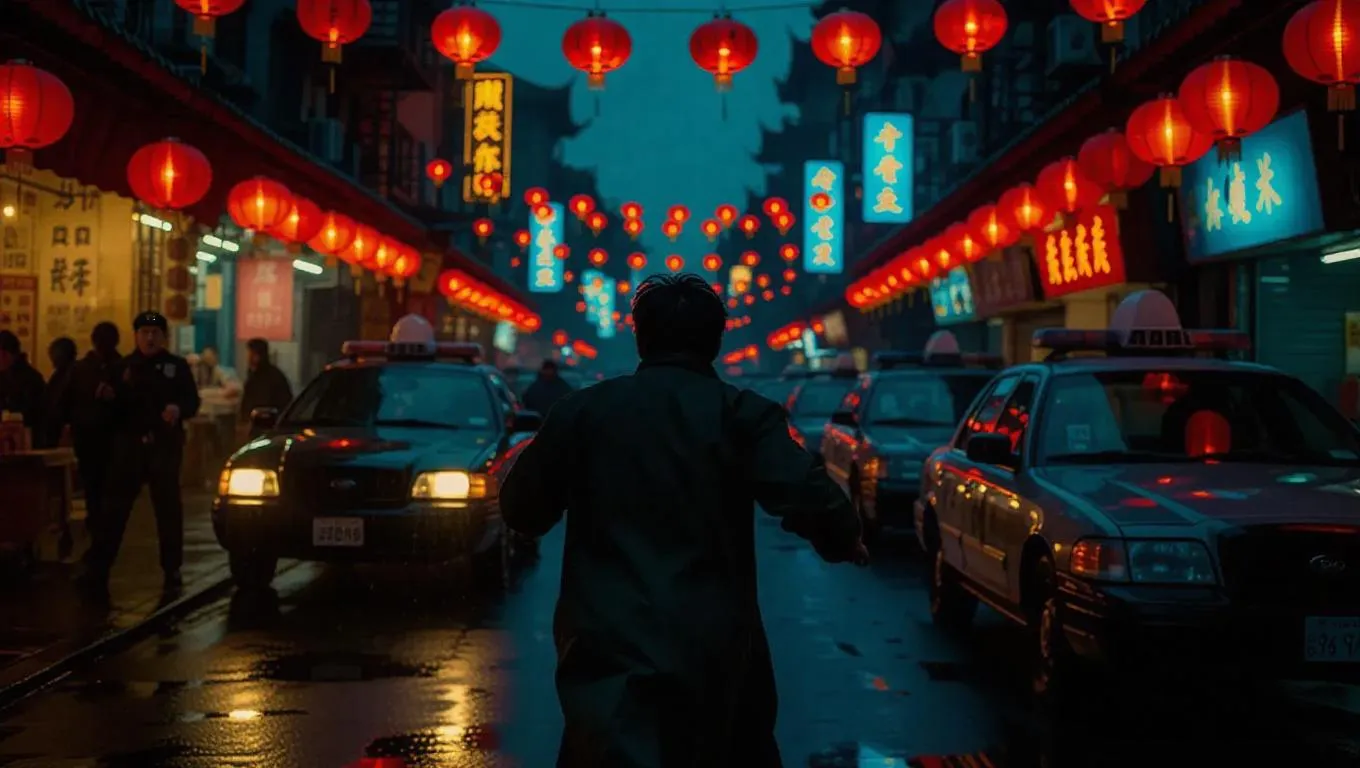 A fugitive in a tattered coat sprints through a bustling Chinatown market, neon signs glowing brightly behind him, as police cars approach swiftly. Lanterns shine softly above. High-angle view with cinematic depth and environmental storytelling.