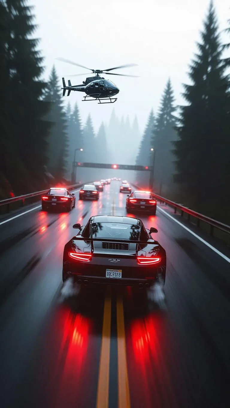A stolen sports car speeds down a foggy highway, its tires screeching as it narrowly avoids a roadblock. Police cars and helicopters pursue relentlessly, their sirens creating a chaotic symphony. The scene is framed with dynamic motion blur and a muted, cinematic palette.