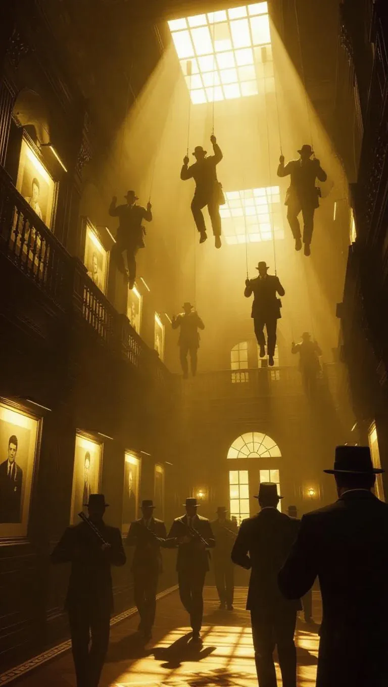 Inside a trendy art gallery in Liberty City, a high-stakes heist unfolds. Thieves, clad in vintage outfits, descend from the ceiling using pulleys, stealthily stealing priceless photographs. Alarms blare, casting a chaotic yellow glow, as security guards sprint through the halls, guns in hand, to intercept the criminals.
