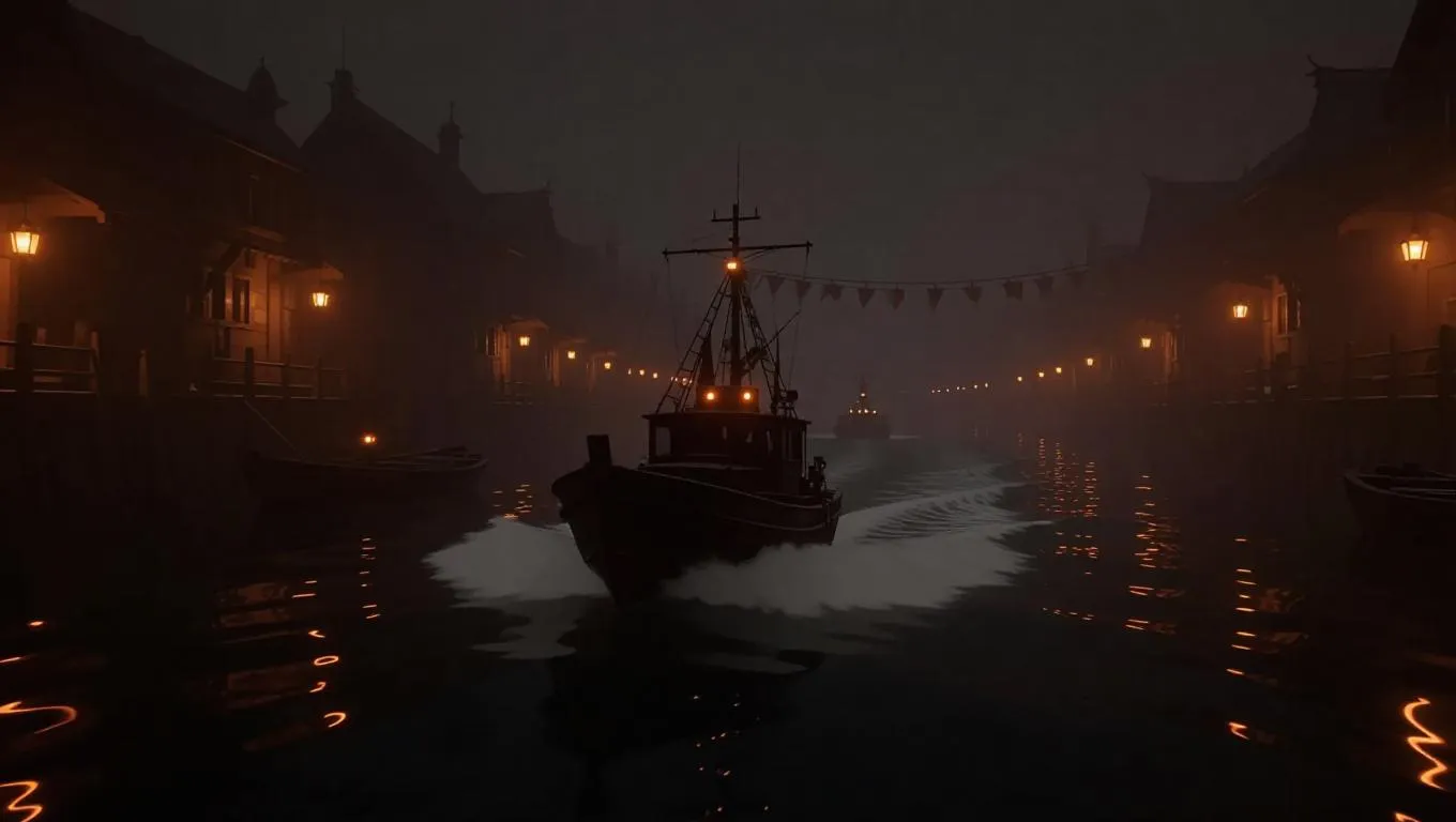 A getaway boat speeds through a foggy fishing village, its crew narrowly avoiding police patrols. The scene is lit by the warm glow of lanterns and the cold mist of the harbor.