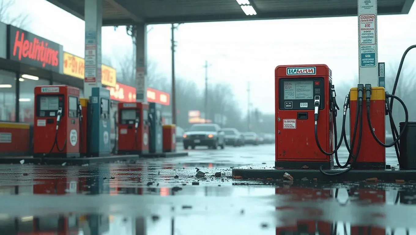 A tense gunfight erupts in a rundown gas station, with shattered glass and broken pumps amplifying the chaos. The scene is framed in a cold, desaturated tone, emphasizing eerie, empty spaces and the echoes of gunfire.