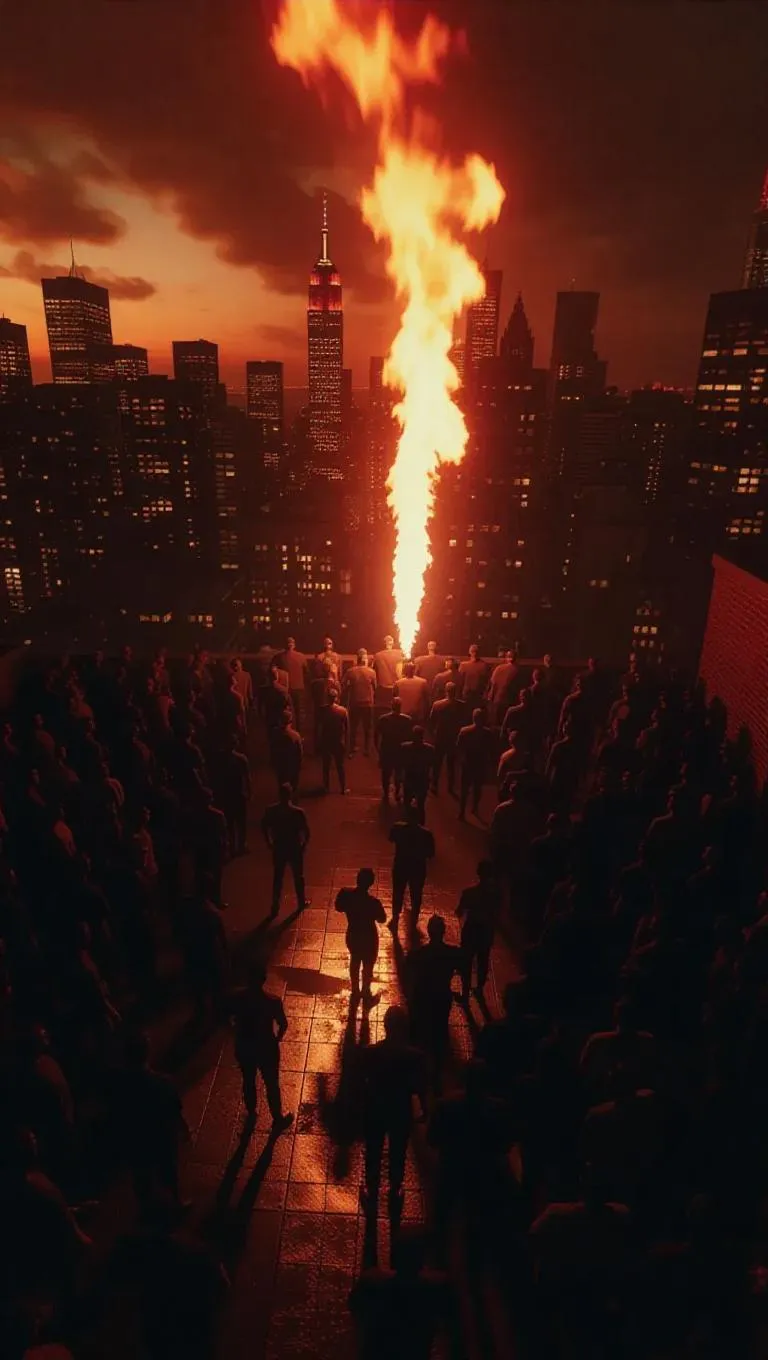 A lavish rooftop party erupts into chaos as rival gangs clash over a high-stakes human trafficking operation. The city skyline appears menacing, with flames casting shadows. The scene is captured with an eerie, high-contrast tone, emphasizing the tension and excitement.