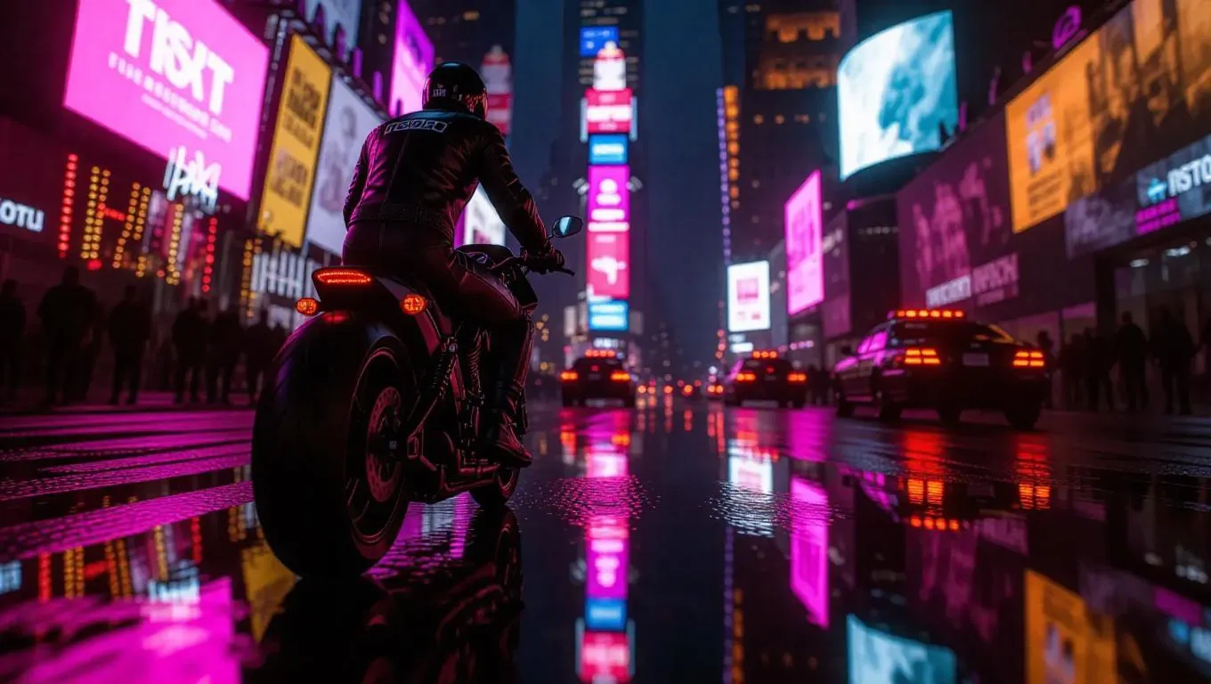 A lone motorcyclist in a black leather jacket speeds down a vibrant boulevard, backlit by animated billboards and swirling city lights. Digital reflections shimmer across puddles, and behind him, a chain of patrol cars twist through city shadows. Motion-capture angle from below, sparks trailing from the tailpipe, dramatic shallow depth of field.