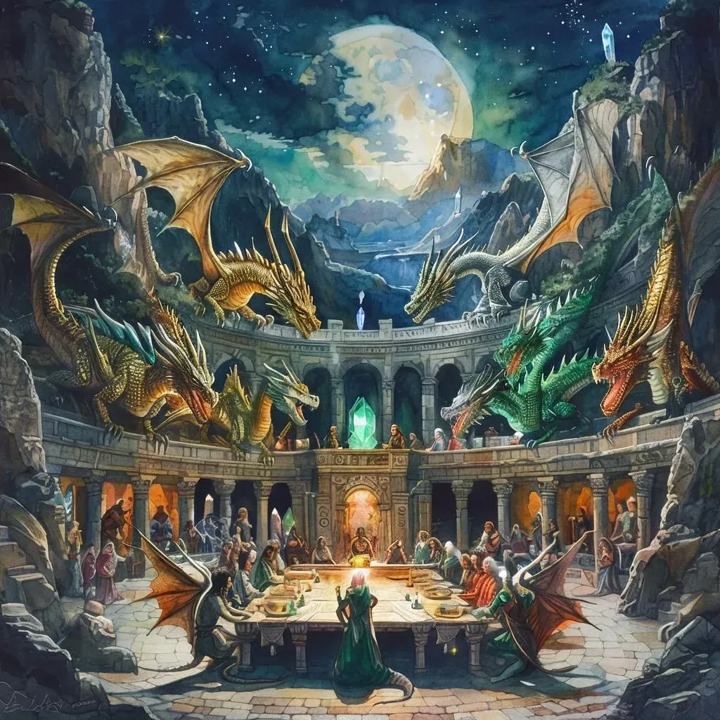 Explore AI-generated mystical fantasy art with this vivid ink painting of ancient gold, silver, copper, and emerald dragons convening in a moonlit mountain coliseum. Realistic watercolor textures highlight intricate scales, ornate runes, and glowing crystals, capturing timeless draconic wisdom. Perfect for fantasy enthusiasts seeking AI-powered, ethereal visuals blending mythical storytelling and artistic precision.