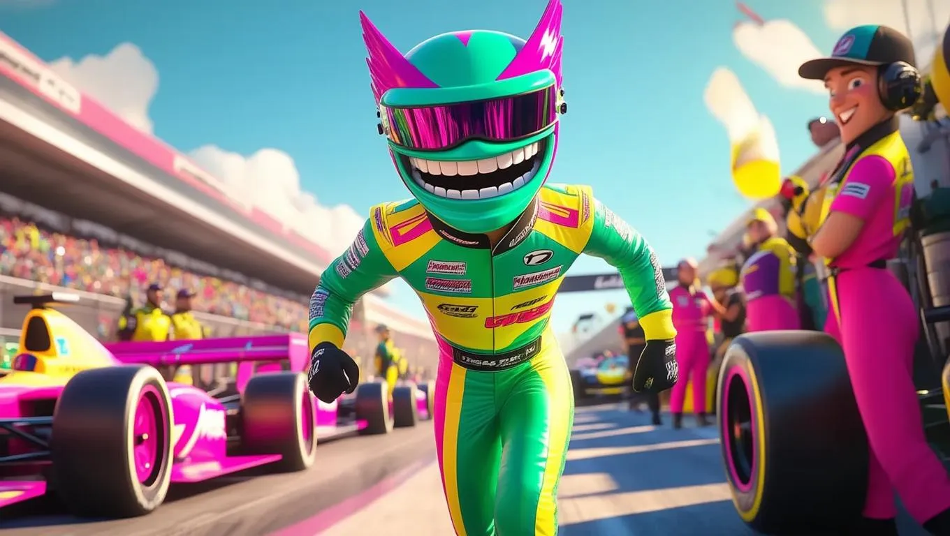 Create a vibrant Pixar-style cartoon AI image of a racing driver with a turquoise-pink tiki mask head, wearing a green-yellow racing suit, strolling through a dynamic pitlane. Transform your vision into playful, professional visuals using VivaGo.ai's AI effects and editing tools for eye-catching, whimsical character designs. Perfect for animated storytelling or unique digital art projects.