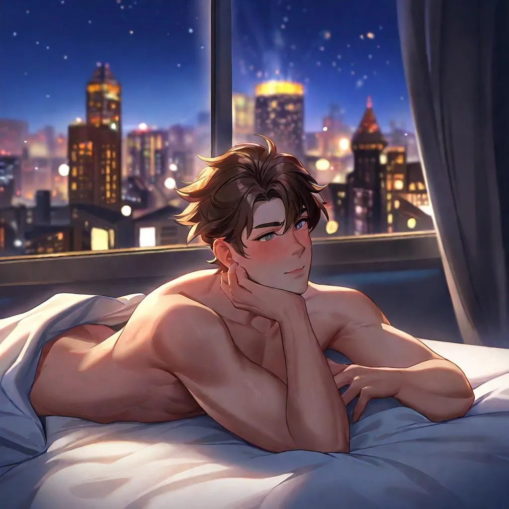 Generate a lifelike AI image of a shirtless young man with brown hair lying on his stomach, blushing in bed. Full-body shot with glowing city lights backdrop enhances emotional intimacy and realism for professional visual storytelling.