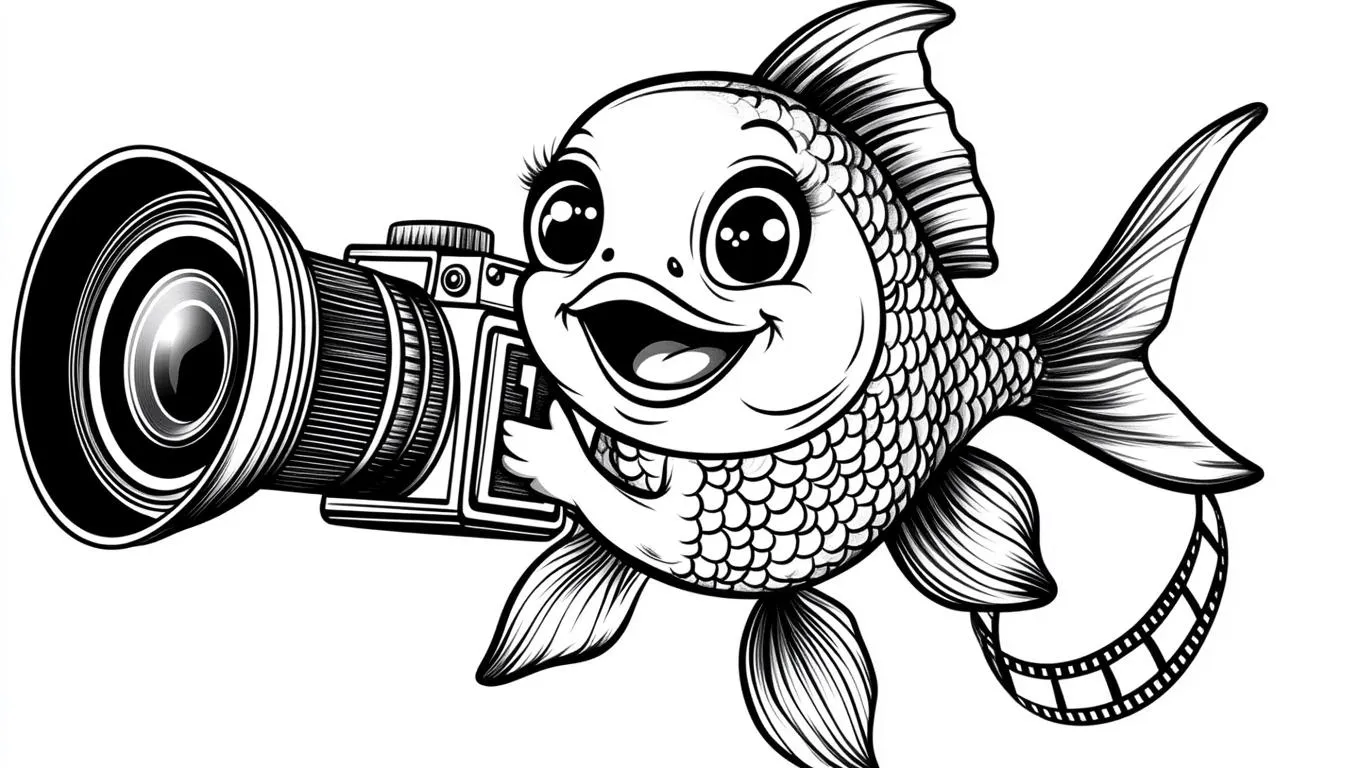Create a playful coloring book page with an animated baby fish holding a video camera and film reel. Bold black-and-white line art on a clean white background sparks creativity. Ideal for kids and artists, this AI-generated design merges whimsical storytelling with simple, engaging outlines for coloring fun.