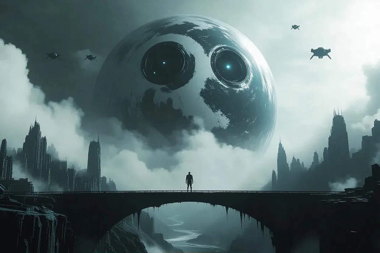 Generate an AI-powered movie poster with cool muted tones, featuring magnetic clouds over a split planet. A lone figure stands on a bridge between a ruined city and a melting world, with robots and eerie sky eyes. Create apocalyptic sci-fi visuals effortlessly with Vivago.ai's AI effects.