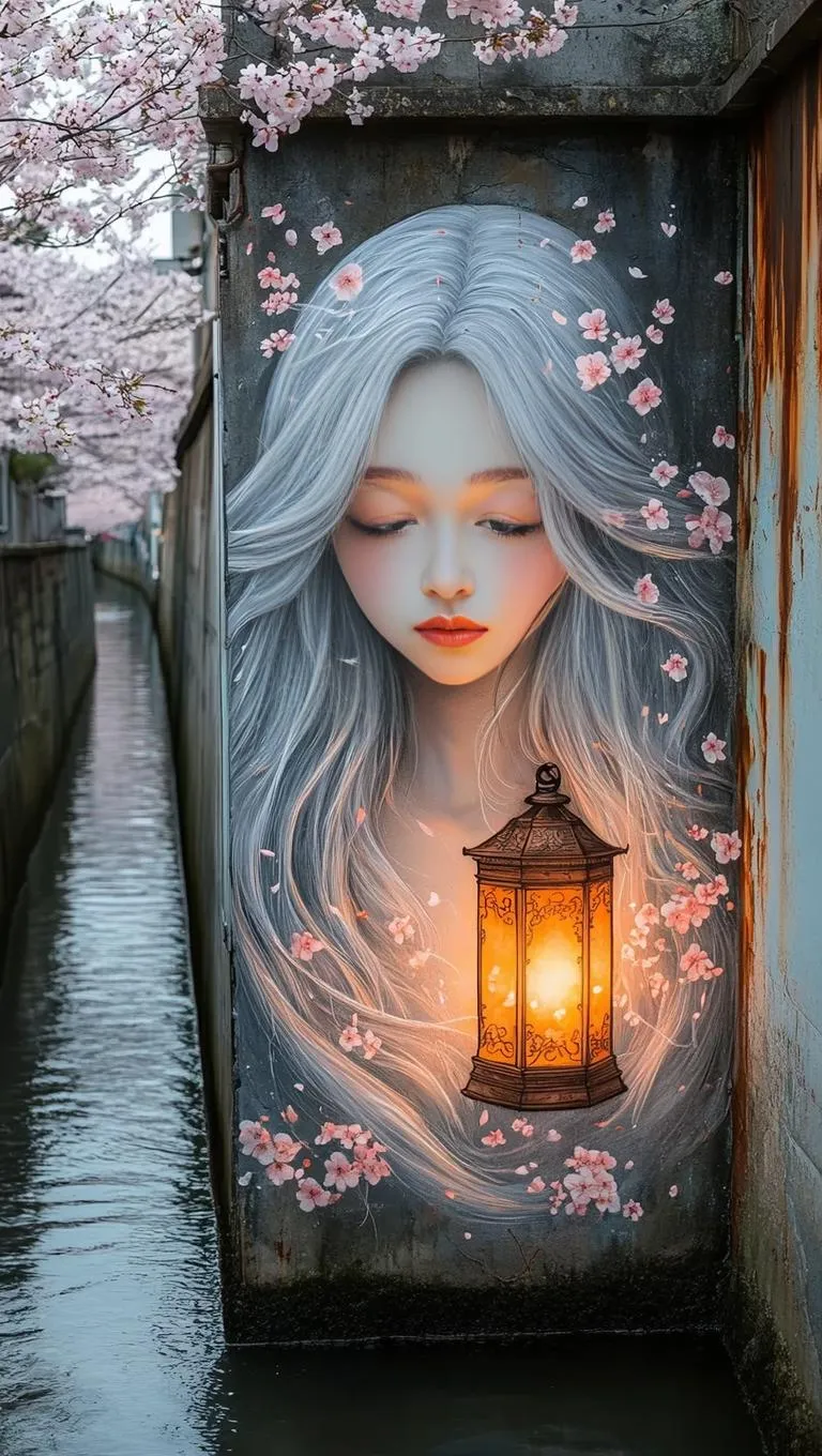 Vivago.ai crafts AI-generated murals blending weathered canals, a silvery-haired girl with a glowing lantern, and swirling cherry blossoms. Experience tranquil, poetic ambiance through precise linework, soft light effects, and blended petals—transform text/prompts into dreamy visual art effortlessly.