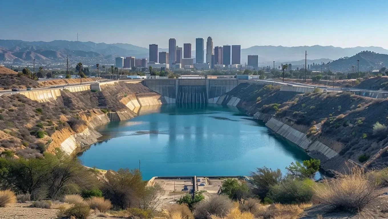 Generate striking AI visuals of a drought-ravaged California reservoir, its cracked basin starkly contrasting a bustling city skyline. This AI-generated image highlights urban growth's strain on water resources, crafted through text-to-image prompts and advanced AI effects for impactful environmental storytelling.