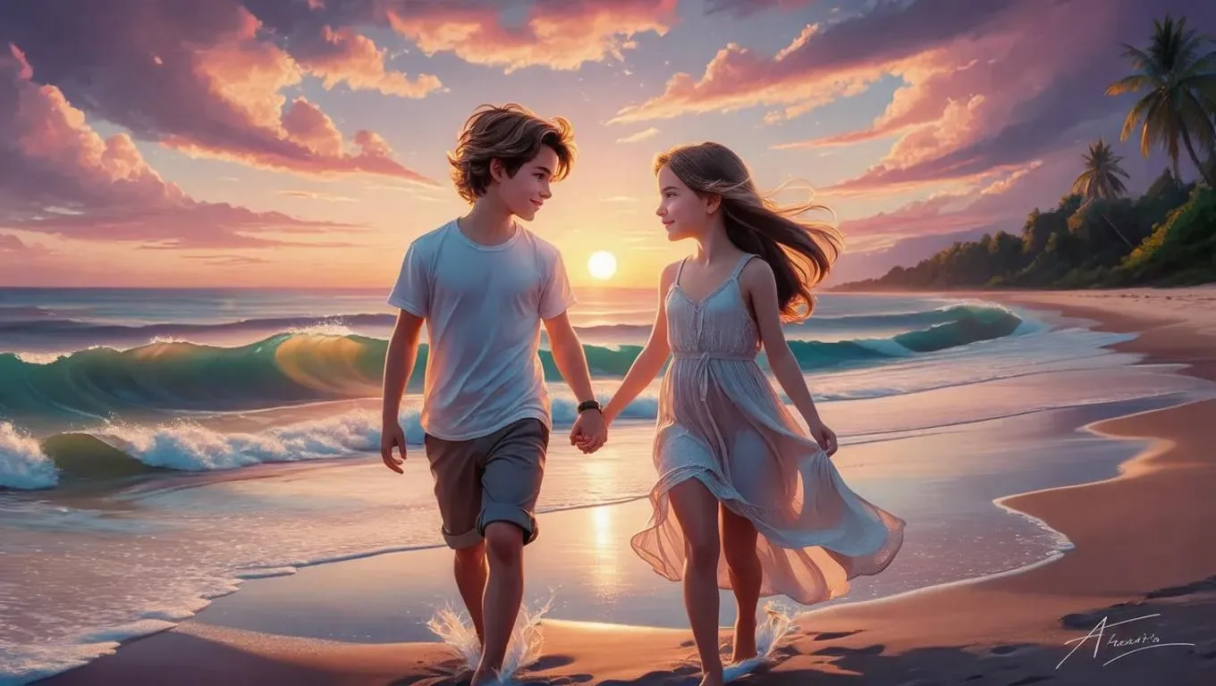 Generate a dreamy AI romantic beach sunset scene with a young couple holding hands, golden light illuminating their faces against vibrant orange, pink, and purple skies. Soft waves meet sandy shores as their summer attire flows in the breeze. Perfect for vivid AI-generated sunset visuals, emotional storytelling, or enchanting coastal backdrop creations. Elevate projects with Vivago.ai's atmospheric AI art tools.