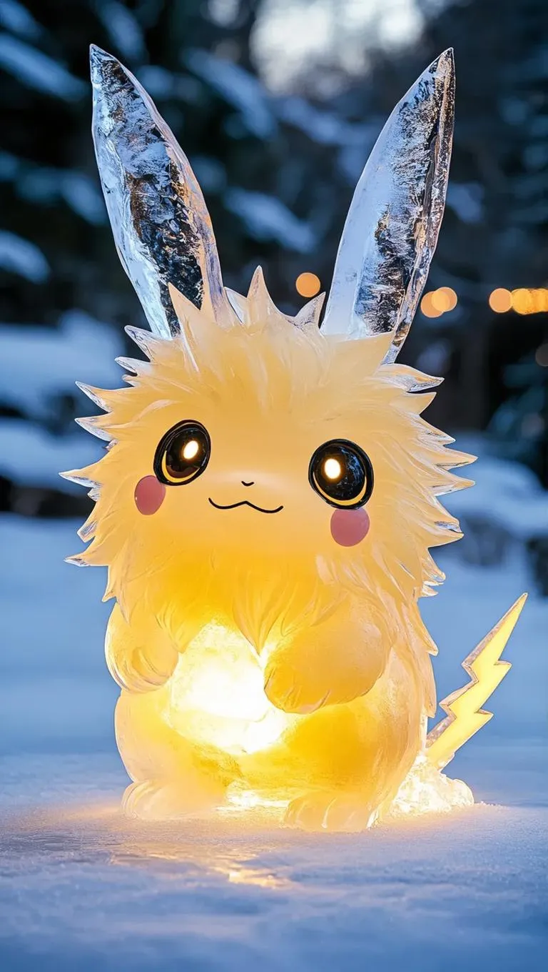 Create enchanting AI-generated anime-style ice sculptures of electric creatures with fluffy yellow fur, glowing eyes, and lightning tails. Immerse in serene winter landscapes with ethereal lighting, showcasing intricate ice translucency and fantasy realism. Perfect for whimsical, professional-grade visuals blending magical atmospheres and detailed artistry.