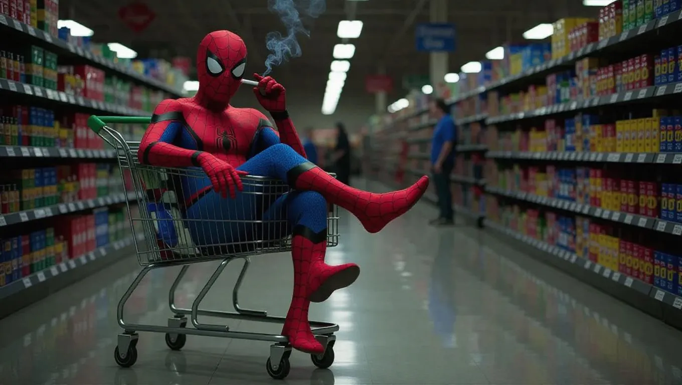 Spider-Man, casually leaning against a Walmart shopping cart, smoking a cigarette, with a mix of urban grunge and superhero flair. The scene is set inside a dimly lit Walmart, with aisles of products and a few scattered shoppers, capturing a moment of unexpected rebellion and anonymity.