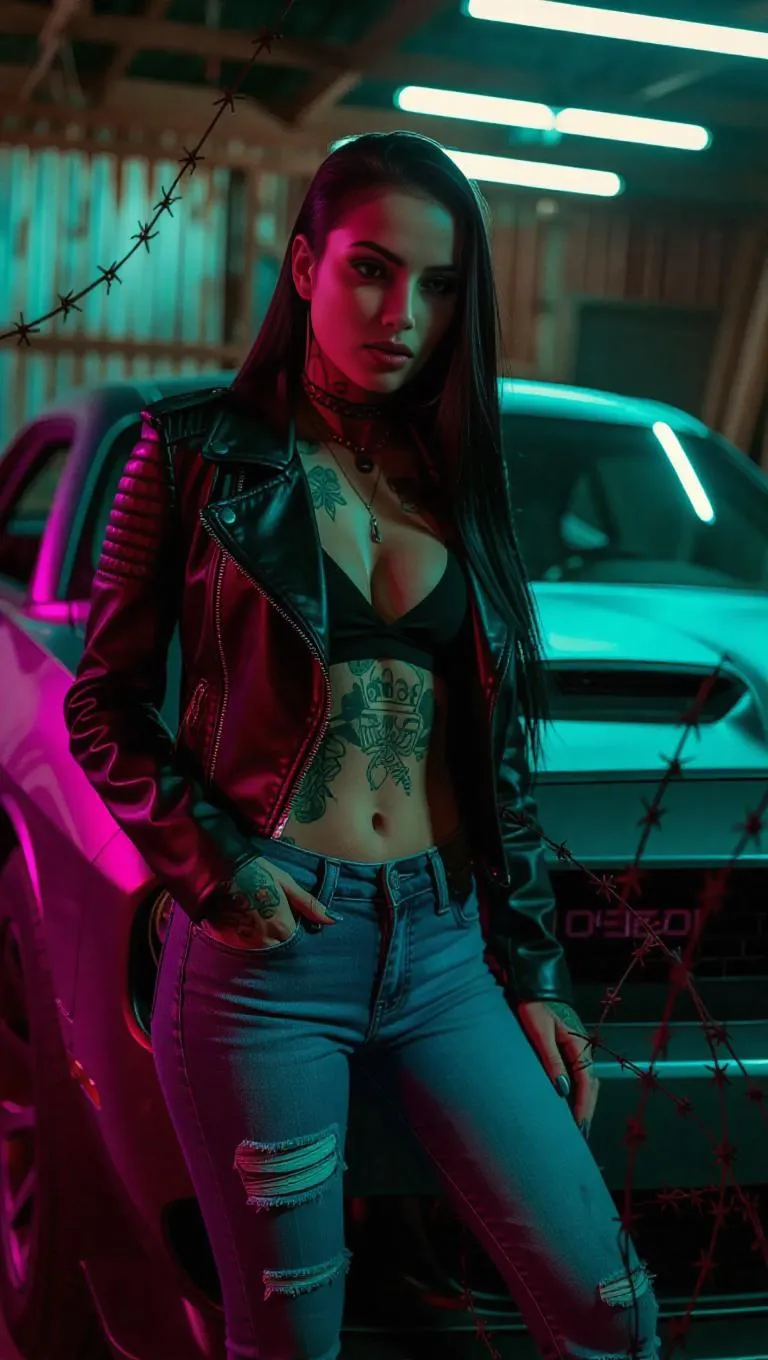 Create striking AI-generated art of a tattooed Arab woman in edgy streetwear, posed against a Dodge Challenger with barbed wire accents. Blends Simon Stålenhag's dystopian vibes, Syd Mead's neon futurism, and Ash Thorp's gritty textures. Explore AI image generation for cyberpunk fashion, automotive scenes, and high-contrast character designs with VivaGo's creative tools.