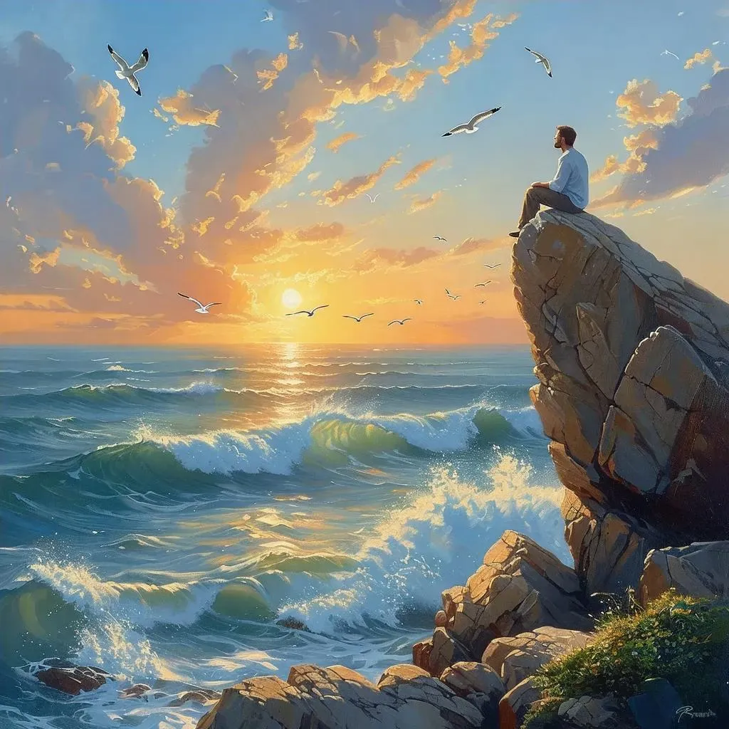Generate stunning AI visuals of a solitary figure on a seaside rock with flying seagulls. Transform text prompts into emotive coastal scenes using Vivago.ai's advanced image generation tools. Ideal for evocative seascapes, dramatic solitude themes, and lifelike nature imagery. Professional editing meets AI creativity.