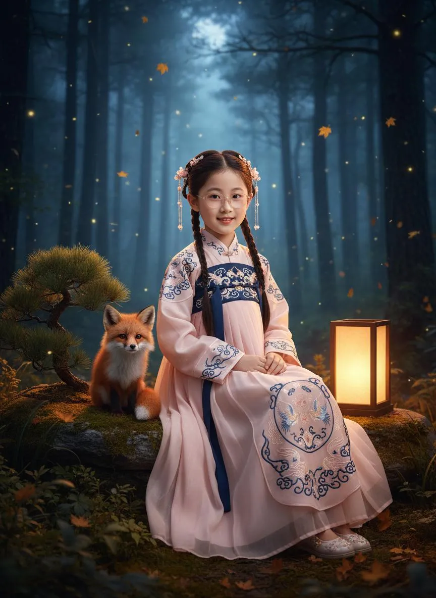 Generate hyper-realistic 8K ancient Chinese portraits with Vivago.ai. Create subjects in delicate pink Hanfu with intricate embroidery, featuring a red fox companion, miniature pine, and glowing lantern in a mystical forest. Achieve cinematic quality with soft studio lighting, falling leaves, and firefly effects. Perfect for artistic, avant-garde photography. (58 words)