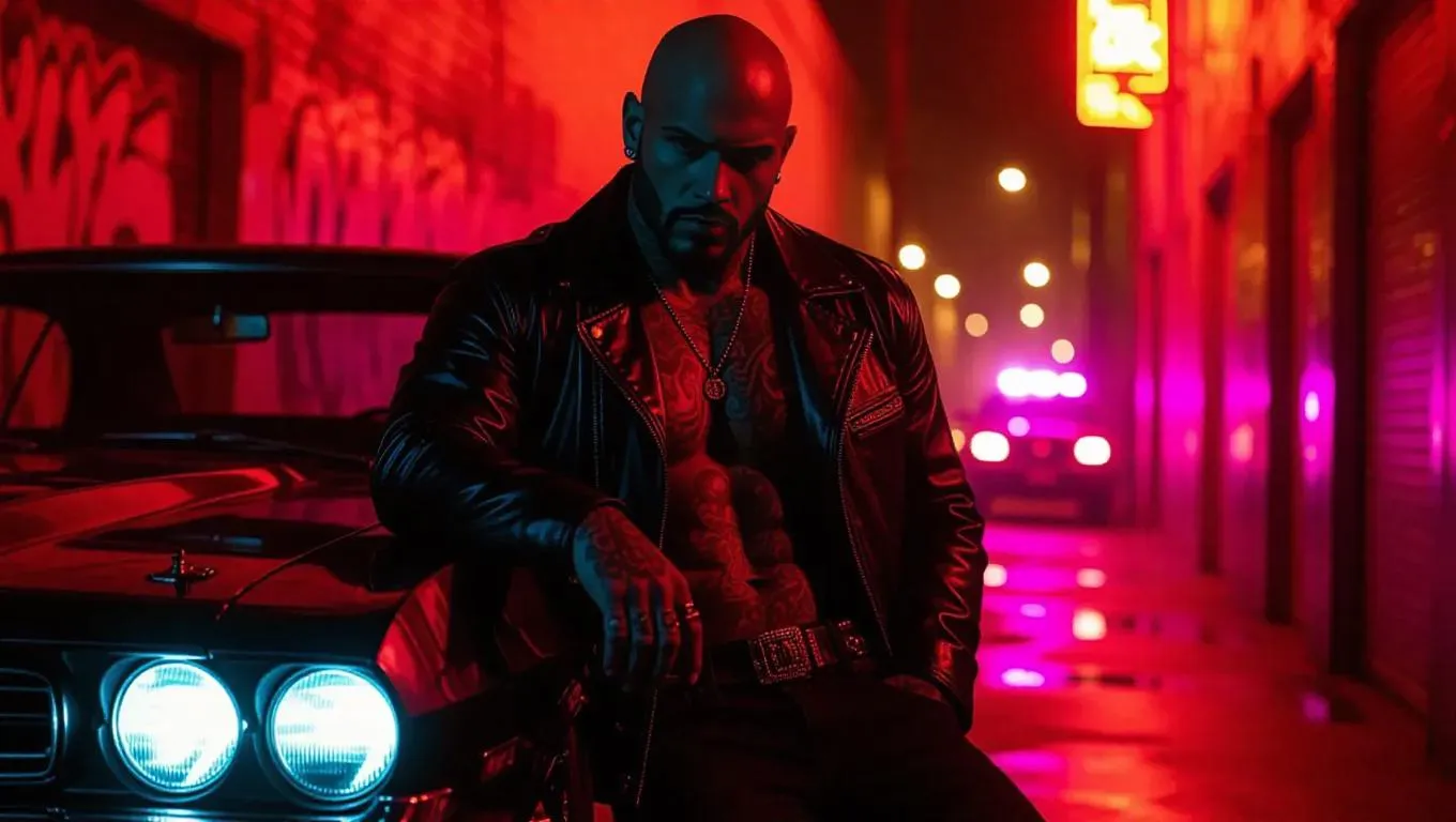 A tattooed gangster in a leather jacket leaning against a muscle car under flickering neon lights, with a graffiti-covered alley and distant police sirens in the background.