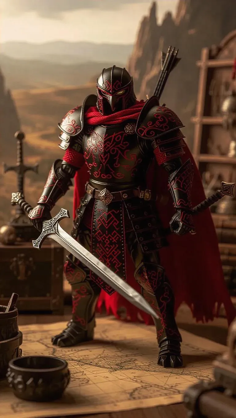 A regal hawk warrior toy, clad in classic black and red armor with intricate tribal designs, wielding a blazing sword. The box showcases an ancient battlefield scene over a distant land, surrounded by mist and adorned with ancient weaponry. Includes a durable canvas pouch for accessories. Set in a historical workshop with maps and relics, bathed in somber lighting, highlighting the toy's majestic and realistic design.