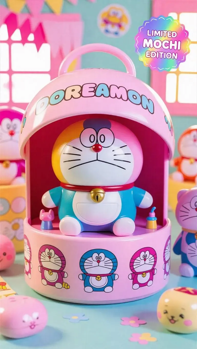 A mochi-inspired collectible action figure of Doreamon, packaged inside a soft, pastel toy box. Doreamon has a squishy, mochi-like design with a glossy finish and a round, chubby body. Oversized, adorable bell, large, sparkling eyes. Packaging features sweet, pastel fonts, mochi illustrations of Doreamon in cute poses, holographic 'Limited Mochi Edition' sticker. Includes accessory parts like a mini gadget and tiny fish. Cozy, pastel-themed school background. Style: mochi, kawaii, high detail, collectible figure, soft lighting, pastel colors.