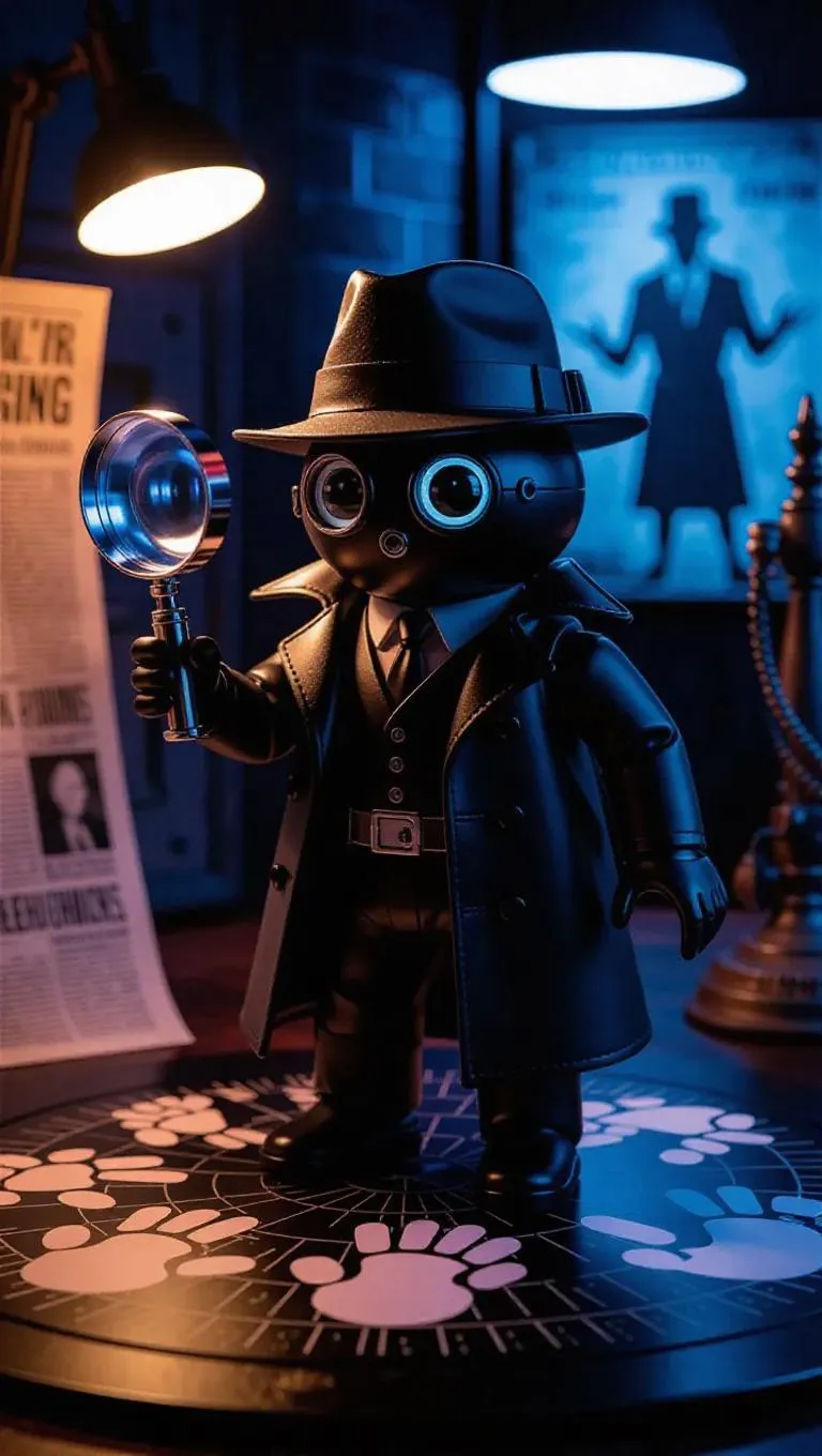 A toy detective droid with a magnifying-glass eye that zooms in on details, a trench-coat made of flexible, reflective material, and a fedora equipped with a miniature radar. Matte-black body with silver accents, exaggerated detective-like features. Revolving crime-scene platform with footprints and fingerprints, vintage newspaper clippings, holographic silhouette of a mysterious figure. Moody blue-toned lighting, film-noir atmosphere, retro-futuristic style.