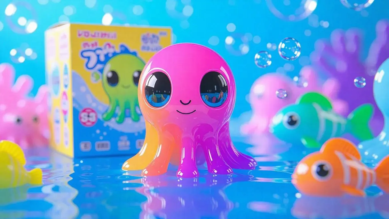 A toy alien jelly figure made of colorful viscous material, featuring large cartoonish eyes and sticky trails. The box is illustrated with ocean-themed graphics, including a fish-shaped accessory and reflective elements. The factory setting is an aquatic-themed toy creation zone, overflowing with water and bubbles. Cool, blue-toned lighting enhances the gelatinous texture, creating an underwater, playful atmosphere. The style is bright and slightly imaginative, blending real elements with exaggerated designs.