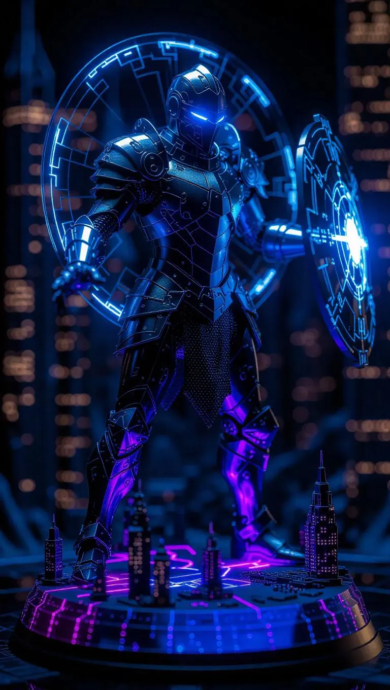Hyper-detailed toy action figure of a futuristic knight, fusing a glowing shield with digital patterns. Translucent energy waves swirl around the figure, crafted from iridescent resin that shifts colors under varying light. The base showcases a floating, abandoned megacity, capturing the knight in a dynamic mid-defensive pose.