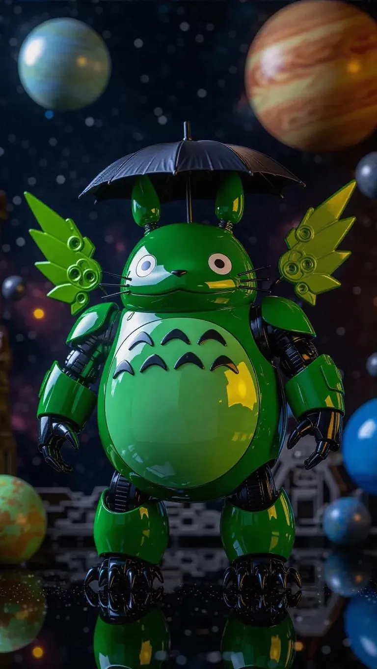 A high-gloss green and black robotic Totoro mech figure with armored wings and a thunder-launching umbrella stands prominently. The packaging features outer-space themed designs and planet-shaped holographic labels, including bonus gear rockets. The background showcases an intergalactic toy station with floating mechanical planets and an adventurous, space-inspired atmosphere. Soft, cosmic light casts glowing highlights, enhancing the glossy finish. Style: Futuristic and brave with a touch of sci-fi flair.
