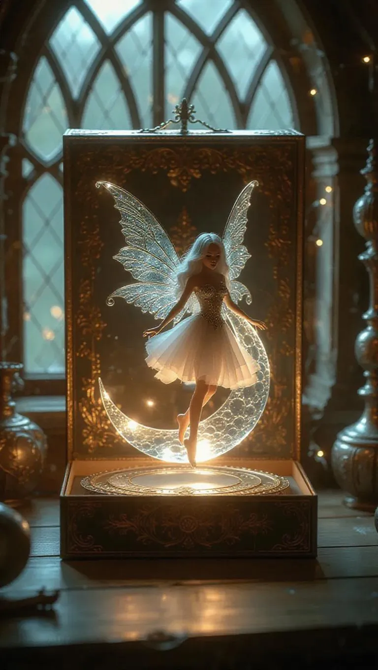 A polymer fairy with shimmering wings and silver hair floats on a moon-shaped spinning base within her box. The packaging displays a glittery design and a pop-out fantasy card. Soft, silvery light illuminates through expansive windows in a mystical toy workshop, creating a dreamlike and enchanting atmosphere. Ethereal style intertwines realism with enchanting fantasy.