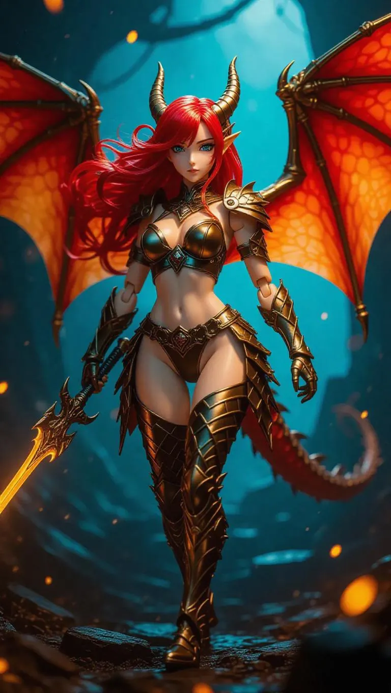 An anime dragon rider action figure with scale-like wings and leather wraps flows off her adventurous body. Fiery red hair cascades down her back, and her dynamic skin glows under bold, intense front lighting. The toy box features mythical motifs, gold accents, and a crystal-clear window shaped like dragon wings. In a fantasy landscape scene, mythical toy parts float midair under fierce, bright side lighting. Style: Mythical Fantasy, Adventurous.