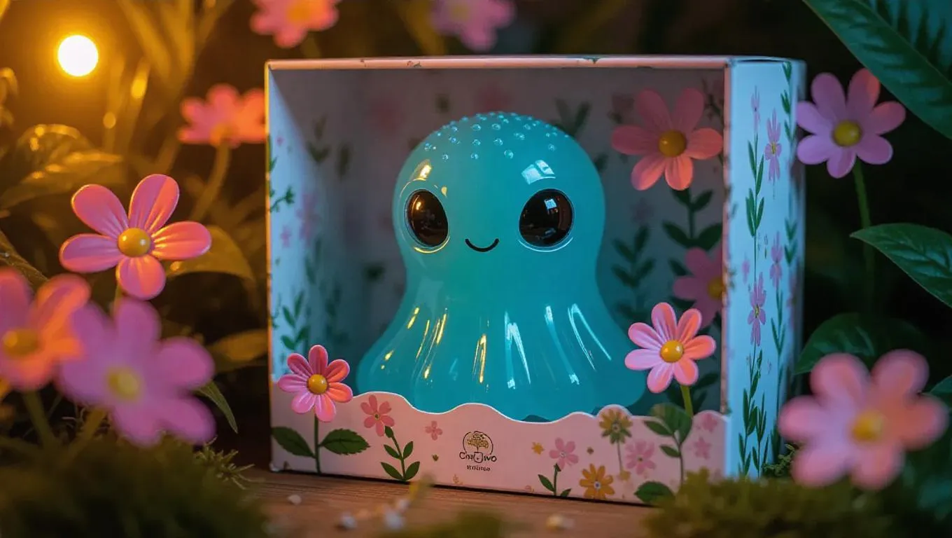 A toy alien jelly figure made of frosted gelatinous material, showcasing twinkling eyes and swirling goo trails. The box is designed with floral-themed graphics, including a flower-shaped accessory and sparkling accents. The factory setting is a whimsical garden toy workshop, overflowing with plants and flowers. Warm, golden lighting highlights the gelatinous texture, creating a dream-like and serene atmosphere. The style is cheerful and slightly ethereal, blending nature with playful elements.
