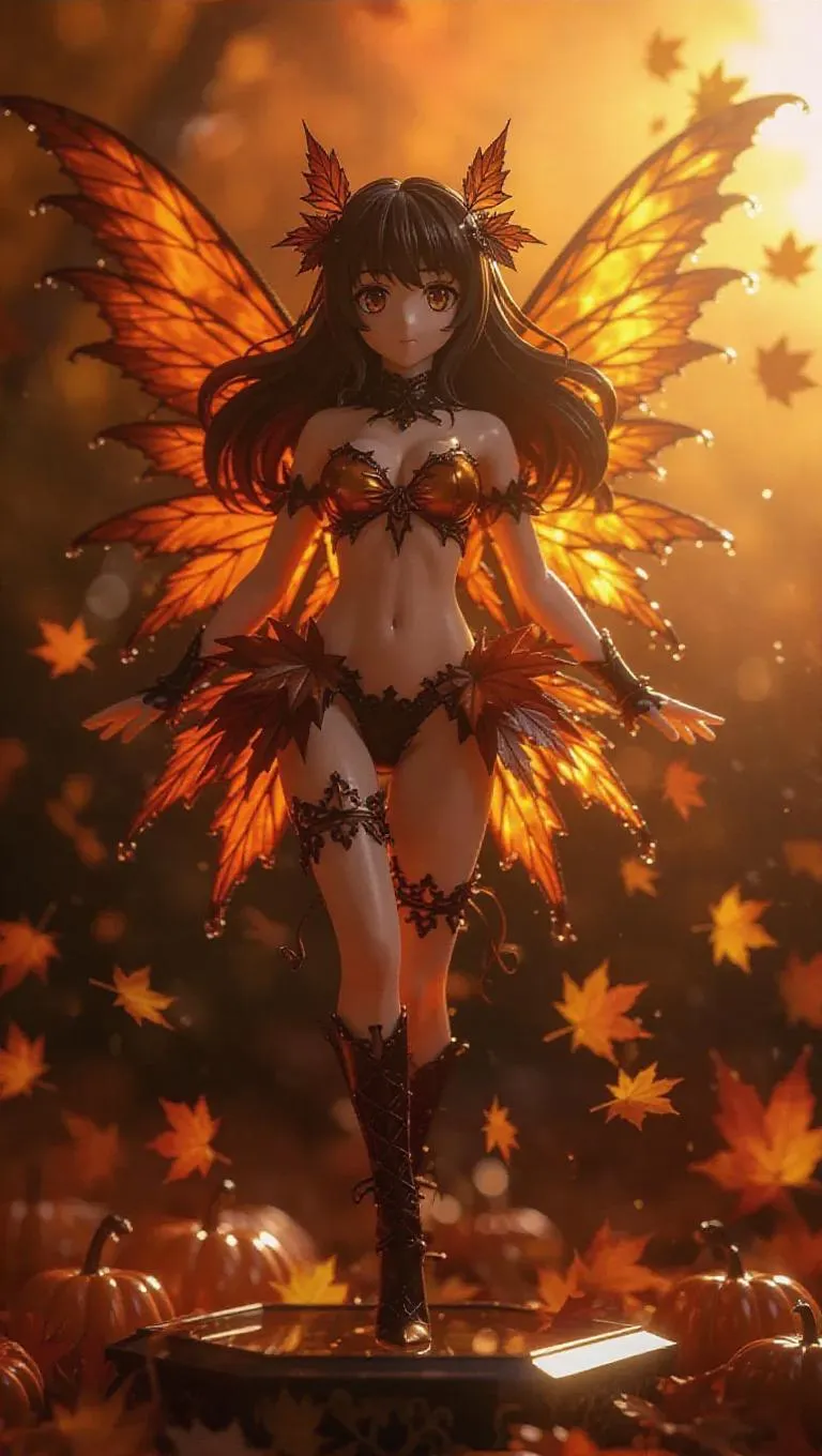 An anime autumn fairy action figure with fiery wings and leaf wraps flows off her enchanting body. Brunette hair cascades down her back, and her warm skin glows under golden, sunset front lighting. The toy box features fall motifs, orange accents, and a crystal-clear window shaped like leaves. In an autumn landscape scene, autumnal toy parts float midair under warm, colorful side lighting. Style: Seasonal Fantasy, Enchanted.