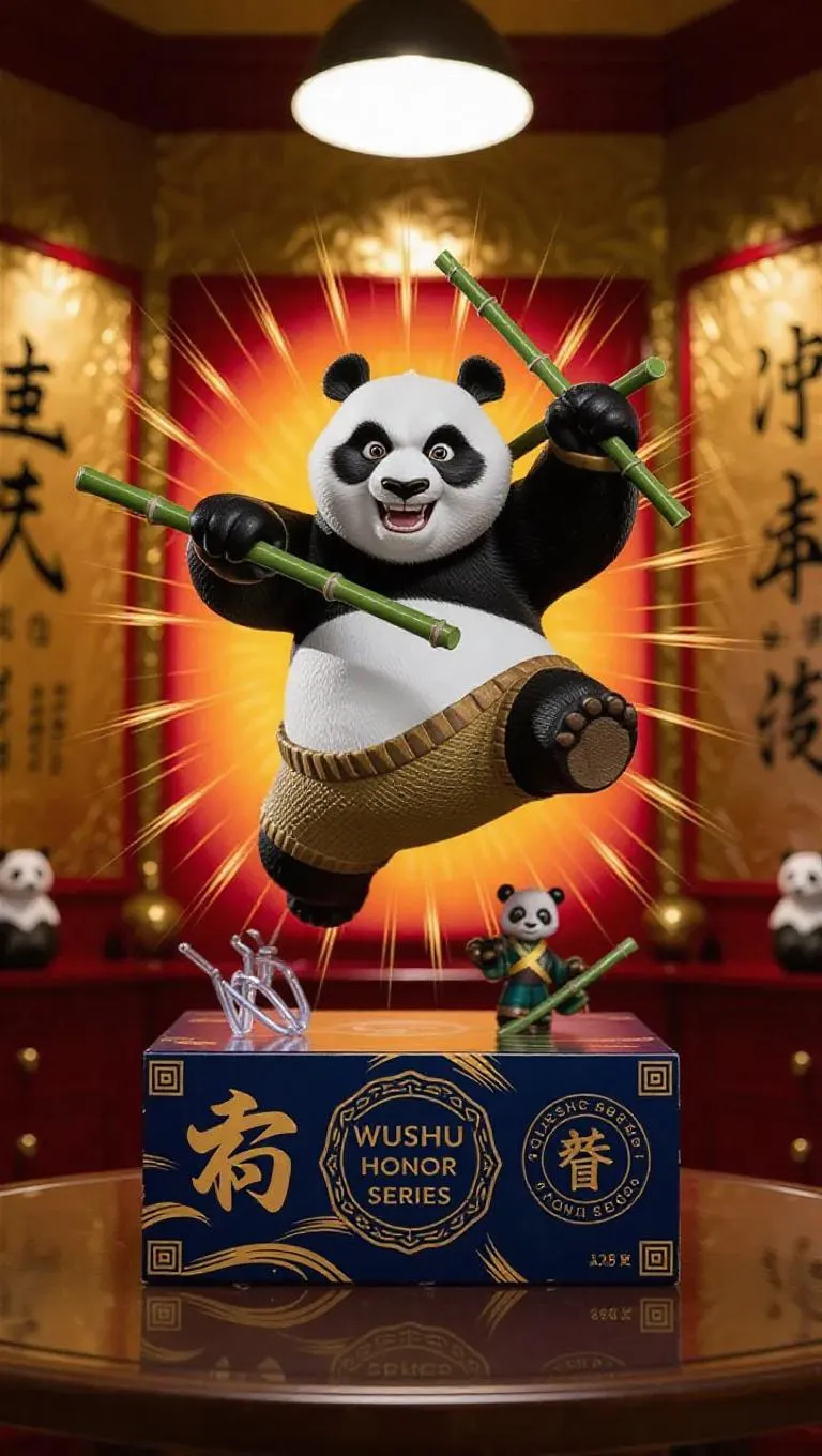 A kung-fu panda toy figure leaps mid-air, wielding poseable bamboo sticks, set against a spark-patterned base. The packaging features Chinese artistic strokes, martial arts legends, and a “Wushu Honor Series” seal. The background is a zen-themed toy shop with gold-covered walls, bathed in radiant, warm light that highlights the intricate details of the panda and the delightful environment. Style: Realistic with a festive atmosphere.