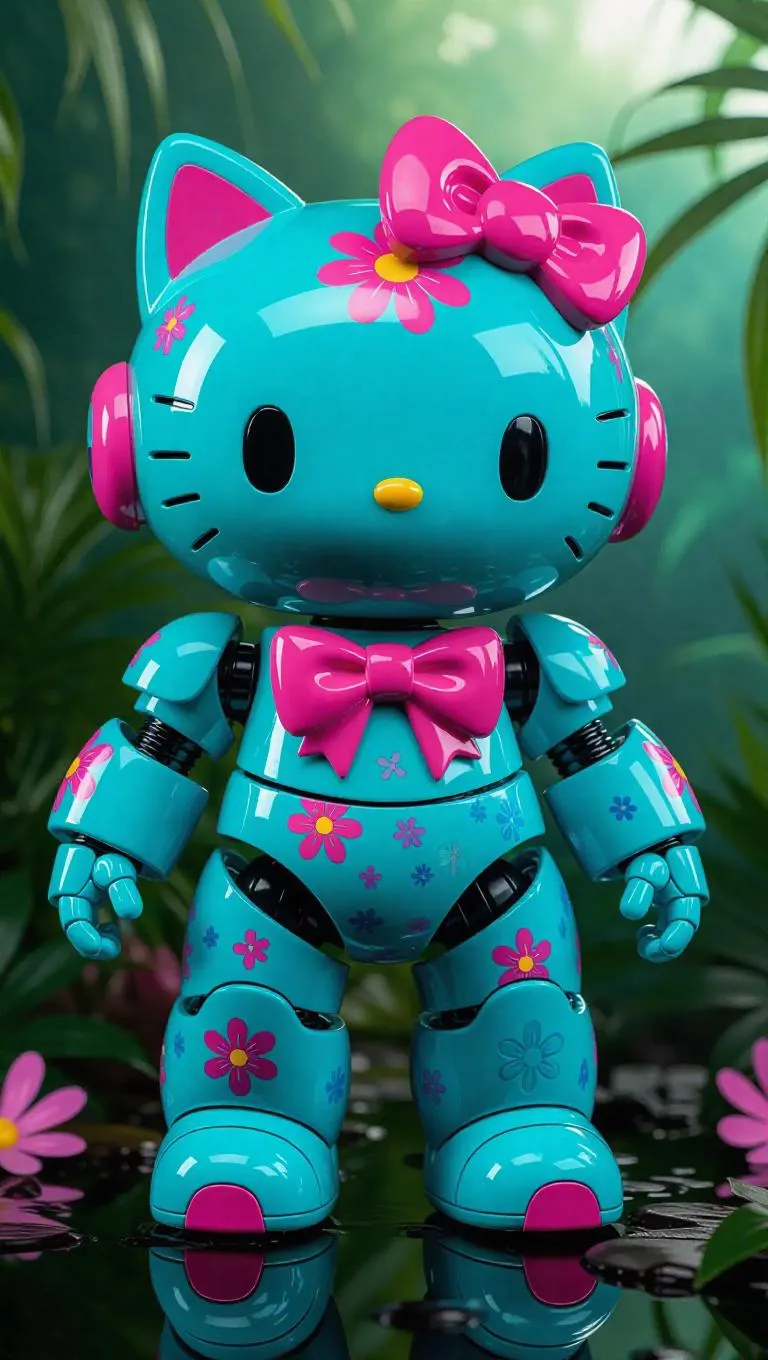 A bright teal and pink robotic Hello Kitty mech figure with parrot ears and a confetti-launching bow stands prominently. The figure's packaging sports tropical-themed designs and fish-shaped holographic labels, including bonus gear items. The background features a lush toy rainforest, filled with swirling mechanical leaves and a dreamy, enchanting atmosphere. Soft, dappled light casts gentle highlights on the figure, enhancing its bright finish. The style merges vibrant and exotic, inviting adventure and discovery.